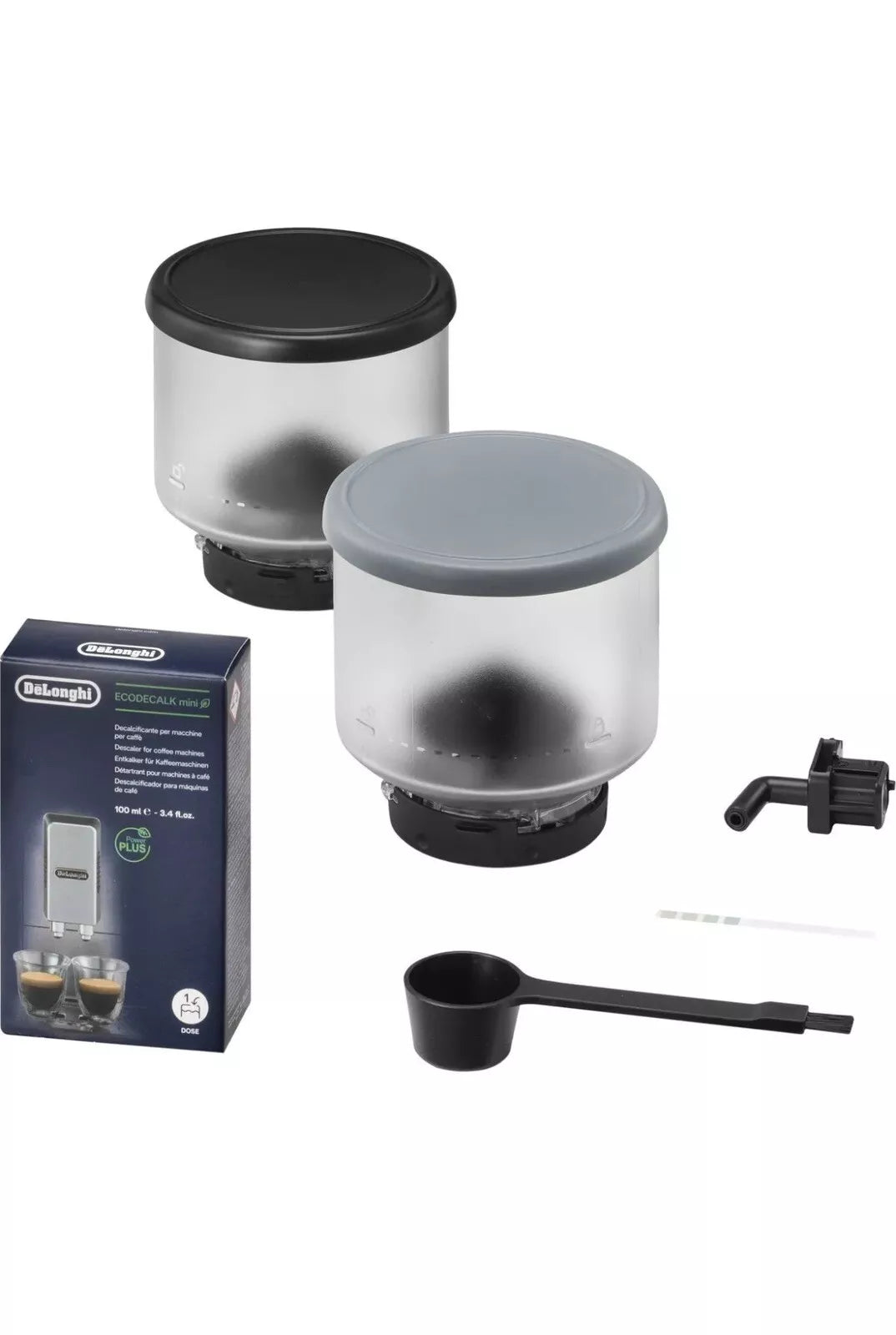 - Box contents: Coffee Machine, Milk Carafe, 2 x 250g Bean Hopper, Descaler, Water Filter, Water Tap, Water Hardness, Ground Coffee Scoop.